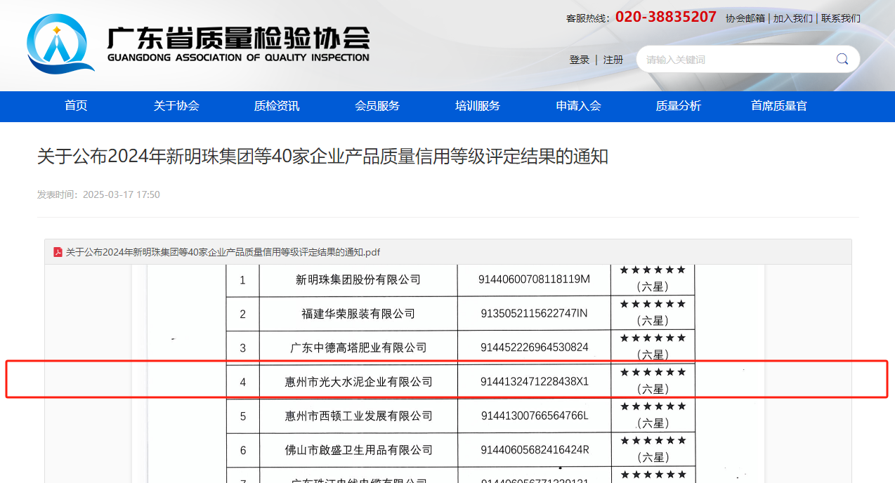 2025年3月17日,廣東省質(zhì)量檢驗(yàn)協(xié)會(huì)正式揭示了2024年度企業(yè)產(chǎn)品質(zhì)量信用等級(jí)評(píng)定結(jié)果,惠州市光大水泥企業(yè)有限公司憑借質(zhì)量信用建設(shè)方面的卓越表現(xiàn),榮獲廣東省市場(chǎng)質(zhì)量信用六星等級(jí)榮譽(yù)證書(最高等級(jí))。